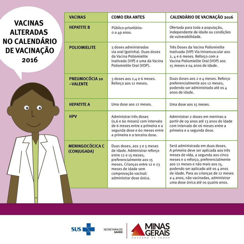 Tendo em vista critérios epidemiológicos, diversos calendários de vacinação foram propostos ao longo dos anos em função de diferentes razões, tais como situação epidemiológica, mudanças nas indicações das vacinas ou incorporação de novas imunizações. Agora, em 2016, seis vacinas apresentaram mudanças, tanto em relação às doses, quanto ao público prioritário. Neste caso, além da Hepapite B, estão Poliomielite, Pneumocócica 10-valente, Hepatite A, HPV e Meningocócica C – conjugada.